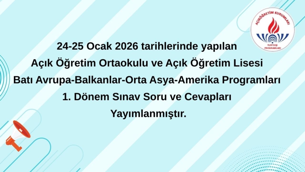 24-25 Ocak 2026 tarihlerinde yapılan Açık Öğretim Ortaokulu ve Açık Öğretim Lisesi Batı Avrupa-Balkanlar-Orta Asya-Amerika Programları 1. Dönem Sınav Soru ve Cevapları Yayımlanmıştır.
