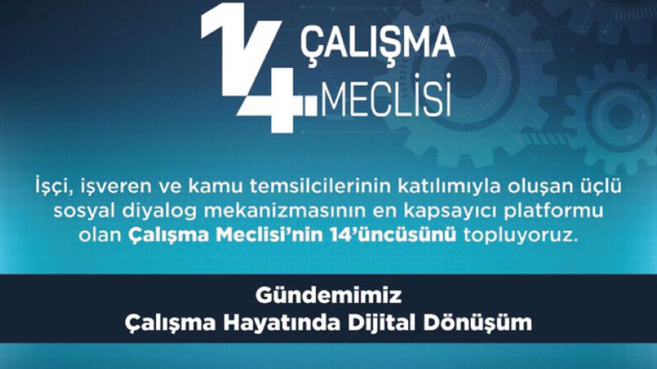 İşçi, işveren ve kamu temsilcilerinin katılımıyla oluşan üçlü sosyal diyalog mekanizmasının en kapsayıcı platformu olan Çalışma Meclisi’nin 14’üncüsünü yarın gerçekleştireceğiz. Gündem: Çalışma Hayatında Dijital Dönüşüm Oturum Başlıkları: Çalışma Hayatında Dijital Dönüşüm Dijitalleşmenin Çalışma Modelleri ve Sendikal Örgütlenmeye Etkileri Dijitalleşmenin Kamu Çalışma Hayatına Etkileri