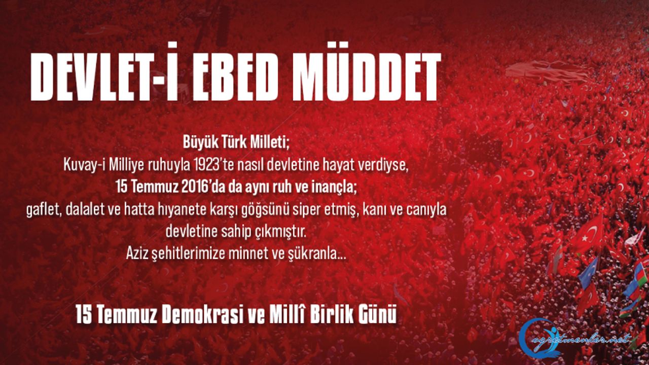 Başta Gazi Mustafa Kemal Atatürk olmak üzere mübarek kanlarıyla Anadolu’yu Türk yapan tüm kahraman şehitlerimizi, 15 Temmuz’un yiğitlerini, milletimizin onuru ve bağımsızlığı uğruna mücadele eden ecdadımızı rahmet, minnet ve saygıyla anıyorum. Allah milletimize bir daha böylesi ihanet geceleri yaşatmasın. Birliğimiz, dirliğimiz daim olsun. Türk milleti var olsun, Türk devleti sağ olsun!”