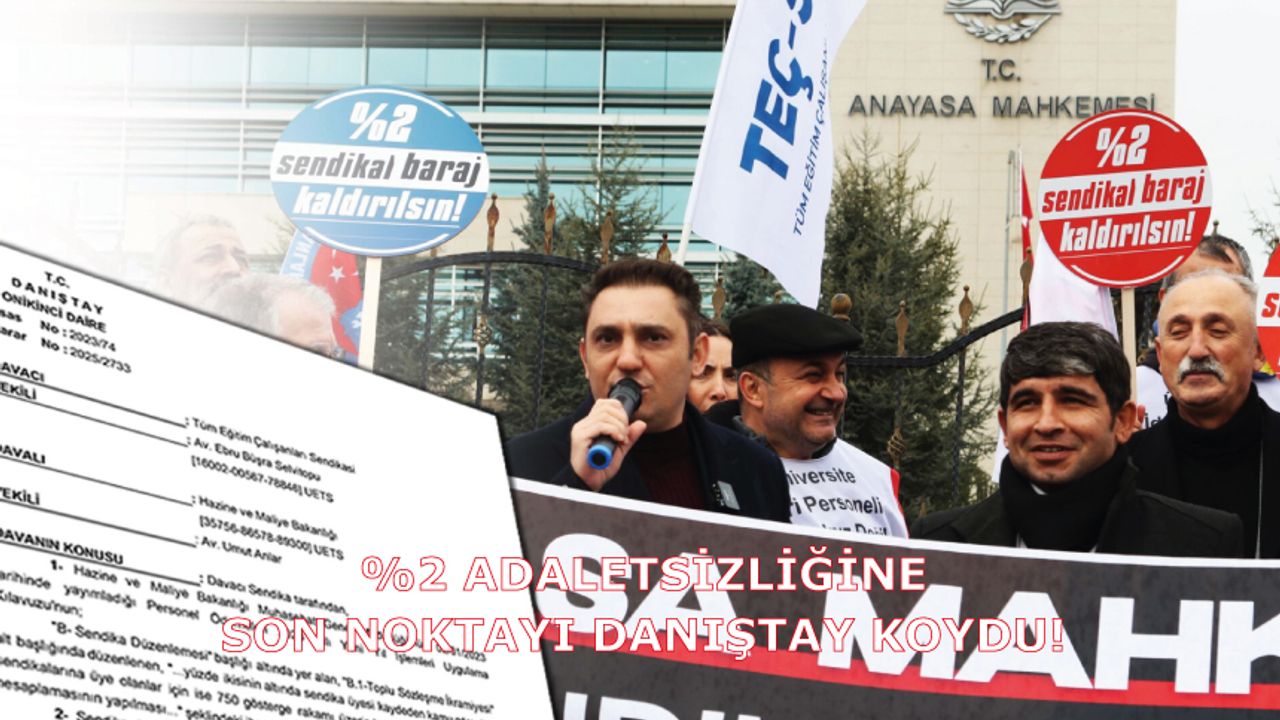TEÇ-SEN olarak üyelerimiz adına açtığımız davada, Danıştay; %2 barajının altında kalan sendikalara üye olan kamu çalışanlarına toplu sözleşme ikramiyesi ödenmemesinin hukuka aykırı olduğuna hükmetti.