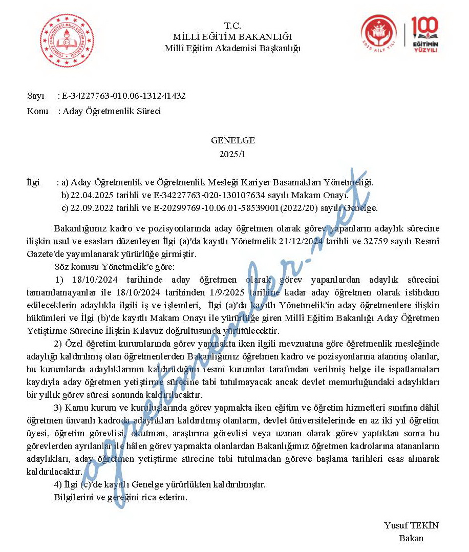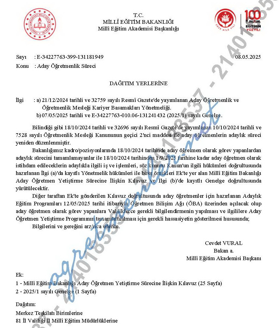 Millî Eğitim Bakanlığı Millî Eğitim Akademisi Başkanlığı 07.05.2025 tarihli, 131241432 sayılı ve 2025/1 Nolu, “Aday Öğretmenlik Süreci” konulu genelge yayımlandı.