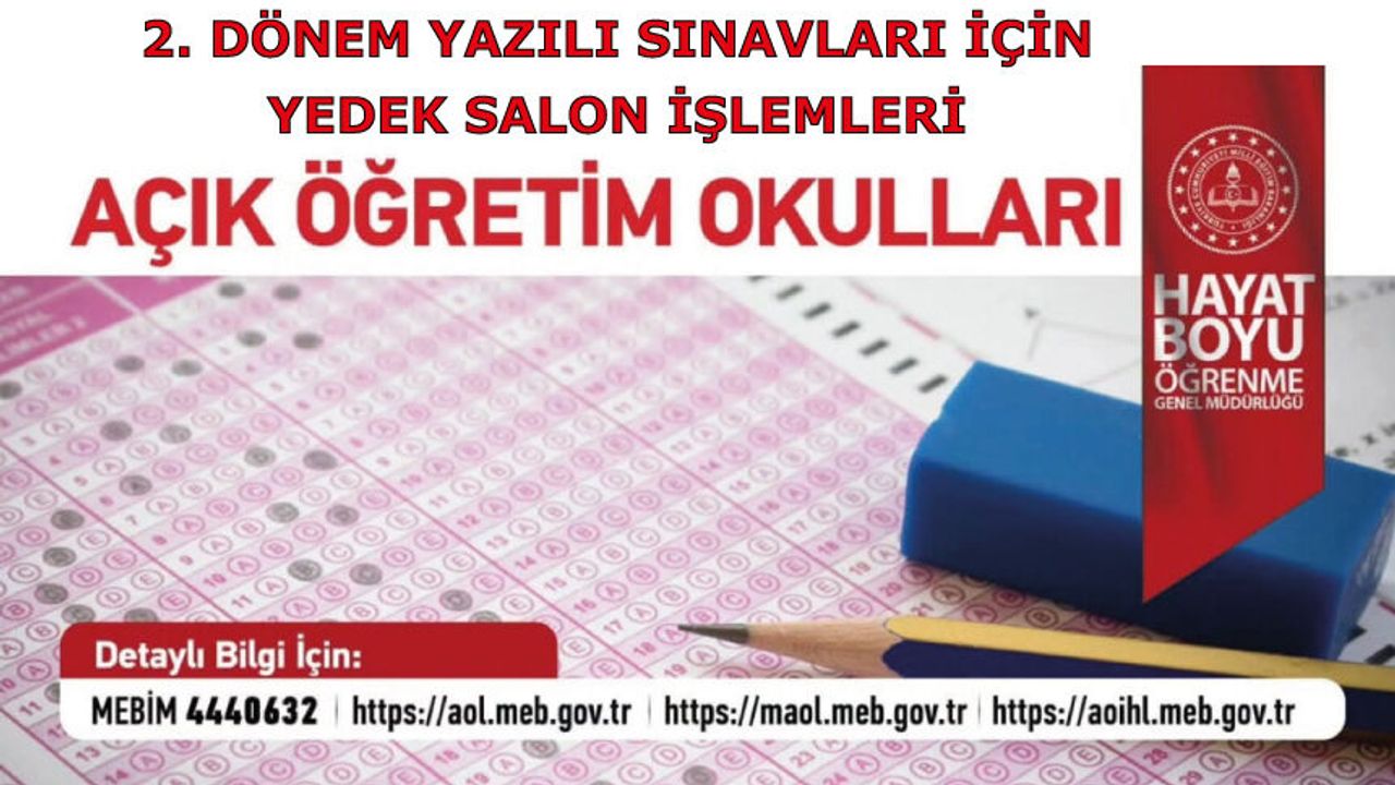 14-15 Mart 2026 tarihlerinde yapılacak olan Açık Öğretim Kurumları 2025-2026 Eğitim Öğretim Yılı 2. Dönem Yazılı Sınavları için Yedek Salon İşlemleri 5-12 Mart 2026 tarihleri arasında yapılacaktır.