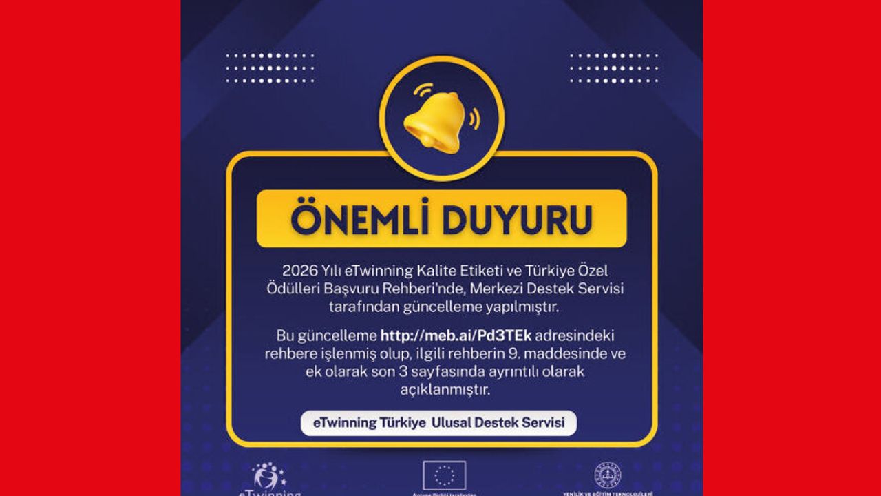 2026 Yılı eTwinning Kalite Etiketi ve Türkiye Özel Ödülleri Başvuru Rehberi'nde, Merkezi Destek Servisi tarafından güncelleme yapılmıştır. Bu güncelleme http://meb.ai/Pd3TEk adresindeki rehbere işlenmiştir.