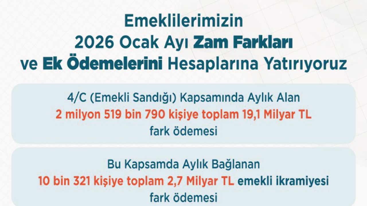 Emekli Sandığı kapsamında; emekli, malul, vazife malulü, dul veya yetim aylığı alan vatandaşlarımızın 2026 yılı zam farkları ile harp ve vazife malullüğü aylığı alan vatandaşlarımızın 2025 yılı ek ödemelerini yarın (23 Ocak Cuma günü) hesaplarına yatırıyoruz. Ülkemizin emektarları kıymetli emeklilerimiz başta olmak üzere vatandaşlarımıza hayırlı olmasını diliyorum.