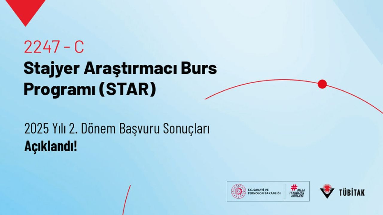 TÜBİTAK Bilim İnsanı Destek Programları Başkanlığı (BİDEB) tarafından yürütülen 2247-C Stajyer Araştırmacı Burs Programı (STAR) 2025 Yılı 2. Dönem STAR Lisans ve STAR Öğretmen çağrıları başvuru sonuçları açıklanmıştır. Başvuru sahipleri, başvuru durumları ile ilgili sonucu, BİDEB Başvuru ve İzleme Sistemi’nden kullanıcı girişi yaparak “Başvurularım” alanından görüntüleyebilirler.