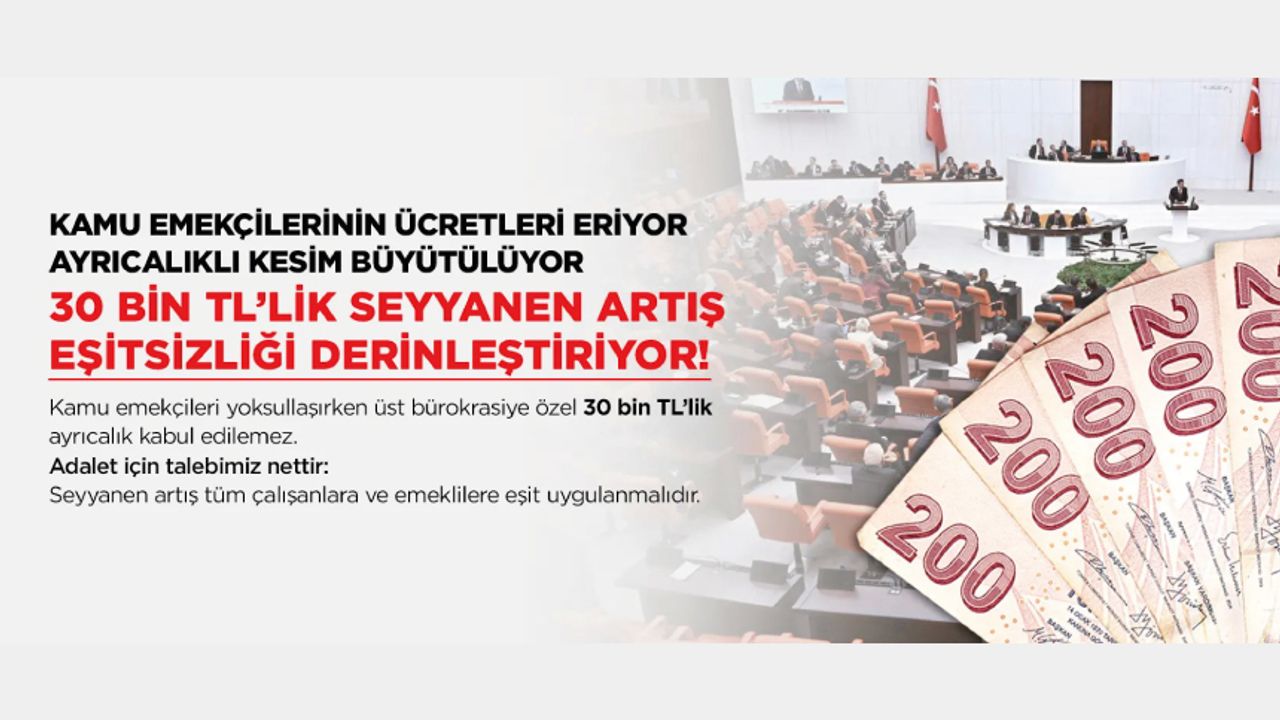 Bugün gelinen noktada hükümet, memurların ve emeklilerin eriyen gelirlerine çözüm üretmek yerine, üst düzey bürokrasiye özel 30 bin TL’lik ayrıcalıklı bir seyyanen artış düzenlemesi yapmaktadır.