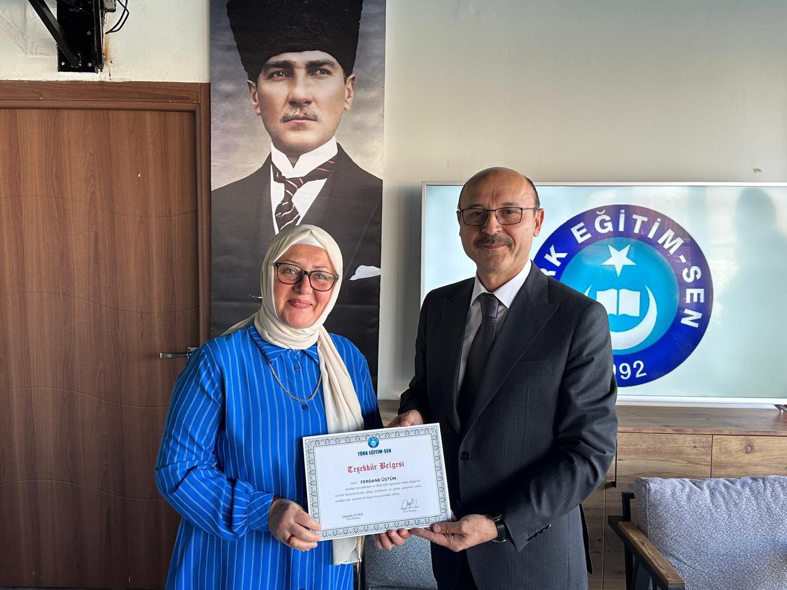 Programda ayrıca bayrağı devreden Selim Aydın ve şube yönetim kurulu üyelerine de Türk Eğitim Sen’e katkılarından dolayı plaketlerini takdim eden Genel Başkanımız Talip Geylan, yeni göreve başlayan Çorum Şube Başkanı Abdullah Güdek ve ekibine başarılar dileyerek vefa göstergesi programından dolayı da tebriklerimi sundu. Geylan, “Başarılı çalışmalarıyla her daim bizi gururlandıran tüm şube ve ilçe yönetim kurulu üyelerimize şükranlarımı sunuyorum. Yürekten inanıyorum ki, fedakâr yol arkadaşlarımın ihlaslı gayretleriyle Türk Eğitim Sen yetkili olacak ve eğitim çalışanları hak ettikleri temsile kavuşacaktır. Varlıkları daim olsun” diye konuştu.