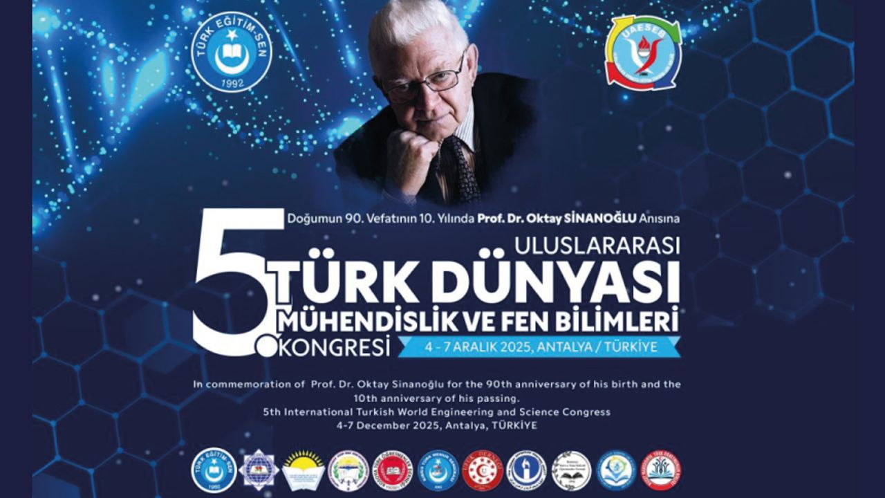 ULUSLARARASI 5. TÜRK DÜNYASI MÜHENDİSLİK VE FEN BİLİMLERİ KONGRESİ TOPLANIYOR. Türk Eğitim Sen ve Uluslararası Avrasya Eğitim Sendikaları Birliği işbirliğinde 5-7 Aralık 2025 tarihinde Antalya’da toplanan ve Türk Dünyası başta olmak üzere 27 ülkeden 510 bilim insanının 490 bildiriyle iştirak edeceği kongre vefatının 10. yılında Oktay Sinanoğlu anısına atfedildi.