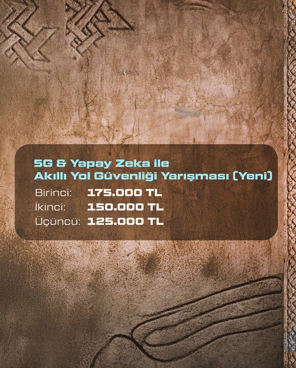 TURKCELL yürütücülüğünde düzenlenen 5G ve Yapay Zeka ile Akıllı Yol Güvenliği Yarışması, haberleşme altyapıları ve yapay zekâ algoritmalarını kullanarak trafik güvenliğini artırmayı hedeflemektedir. Yarışma kapsamında takımlar; gerçek zamanlı veri analizi, akıllı algılama sistemleri ve karar destek mekanizmalarına yönelik çözümler geliştirecektir. Ulaşımda güvenliği teknolojiyle ileriye taşımak isteyen tüm ekipler yarışmaya davetlidir.