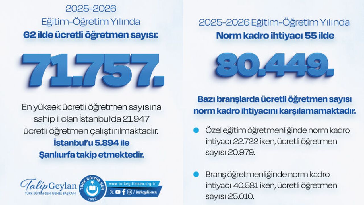 Türk Eğitim-Sen, her yıl olduğu gibi 2025-2026 Eğitim-Öğretim Yılında da ülkemizde ücretli öğretmen sayılarını araştırdı. 81 İl Valiliğinden ücretli öğretmen sayısını isteyen sendikamıza 62 il cevap verdi. Buna göre ülkemizde 2025-2026 eğitim-öğretim yılında 62 ilde ücretli öğretmen sayısı 71 bin 757 oldu.
