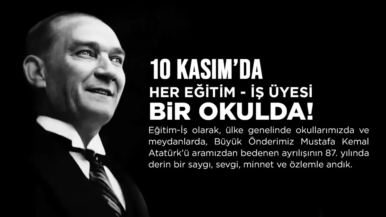 Eğitim-İş olarak, ülke genelinde okullarımızda ve meydanlarda, Büyük Önderimiz Mustafa Kemal Atatürk’ü aramızdan bedenen ayrılışının 87. yılında derin bir saygı, sevgi, minnet ve özlemle andık.