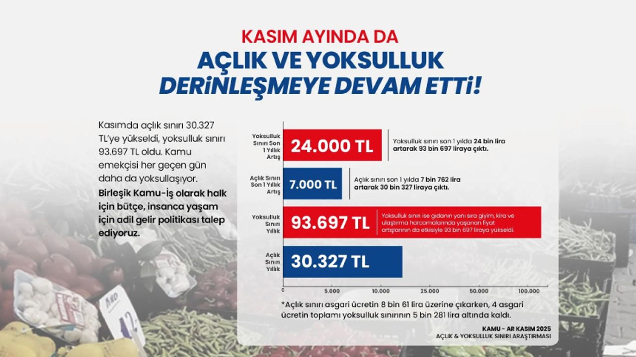 Birleşik Kamu-İş Konfederasyonunun Ar-Ge birimi KAMU-AR’ın dört kişilik bir ailenin, dengeli ve sağlıklı beslenebilmesi için gereli gıda harcamasının yanı sıra diğer ihtiyaçlarını da yoksunluk hissi çekmeden karşılayabilmesi için aylık olarak yapması gereken harcamayı dikkate alarak hesapladığı açlık-yoksulluk sınırı araştırmasının Kasım 2025 sonuçları açıklandı.