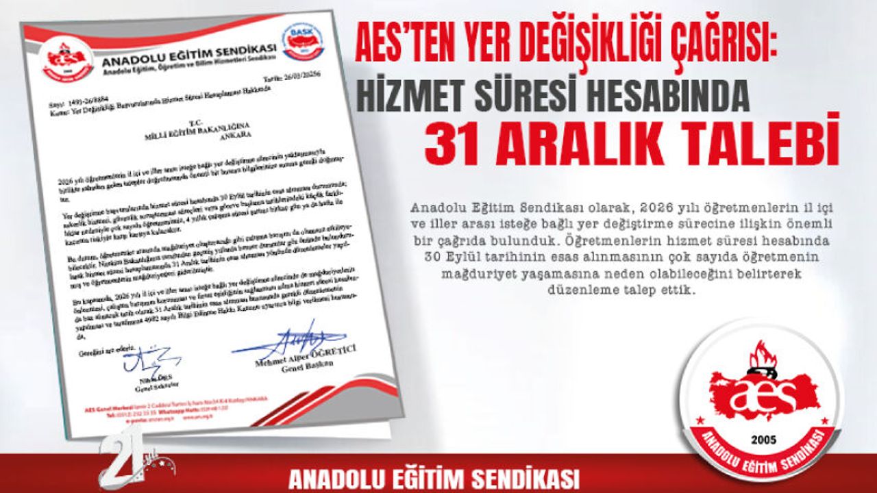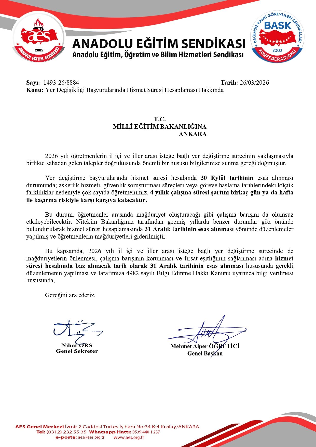 Anadolu Eğitim Sendikası olarak, 2026 yılı öğretmenlerin il içi ve iller arası isteğe bağlı yer değiştirme sürecine ilişkin önemli bir çağrıda bulunduk. Öğretmenlerin hizmet süresi hesabında 30 Eylül tarihinin esas alınmasının çok sayıda öğretmenin mağduriyet yaşamasına neden olabileceğini belirterek düzenleme talep ettik.