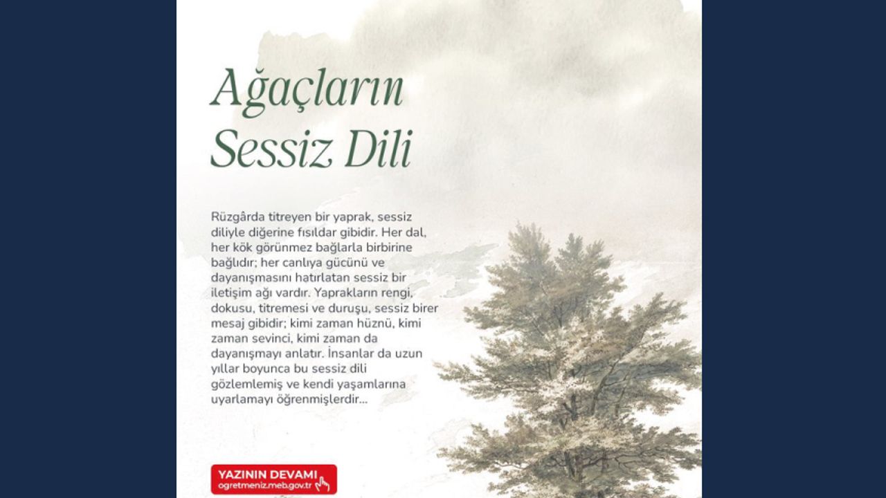 Tuba KAYNUN'dan "Ağaçların Sessiz Dili" denemesi ÖğretmenİZ dergisinde! Doğanın kendi içindeki dayanışmasını anlatan bu yazı ile ruhunuzda bir bahar yaratın! Okumak için http://meb.ai/UH2c0oy Sen de kalemini al, eserlerinle iz bırak! ÖğretmenİZ dergisinde yer al! Dergide yayımlanmasını istediğin çalışmalarını göndermek için https://meb.ai/9giDiI #öğretmeniz