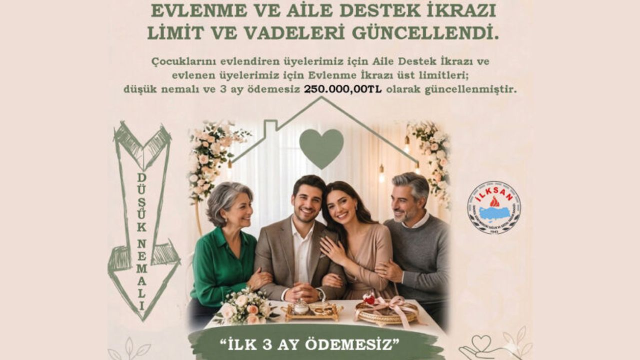 Çocuklarını evlendiren üyelerimiz için Aile Destek İkrazı ve evlenen üyelerimiz için Evlenme İkrazı üst limitleri; 12, 18 ve 24 ay vadede maliyetsiz ve düşük nemalı 250.000,00TL olarak güncellenmiştir.