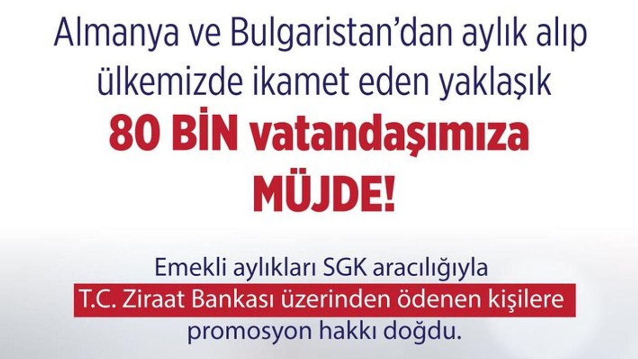 Almanya ve Bulgaristan’dan aylık alıp ülkemizde ikamet eden vatandaşlarımıza MÜJDE! SGK aracılığıyla T.C. Ziraat Bankası üzerinden aylığını alan yaklaşık 80 bin vatandaşımız artık promosyon alabilecek. Başvuru için aylık almakta olduğunuz T.C. Ziraat Bankası şubesine uğramayı unutmayın!