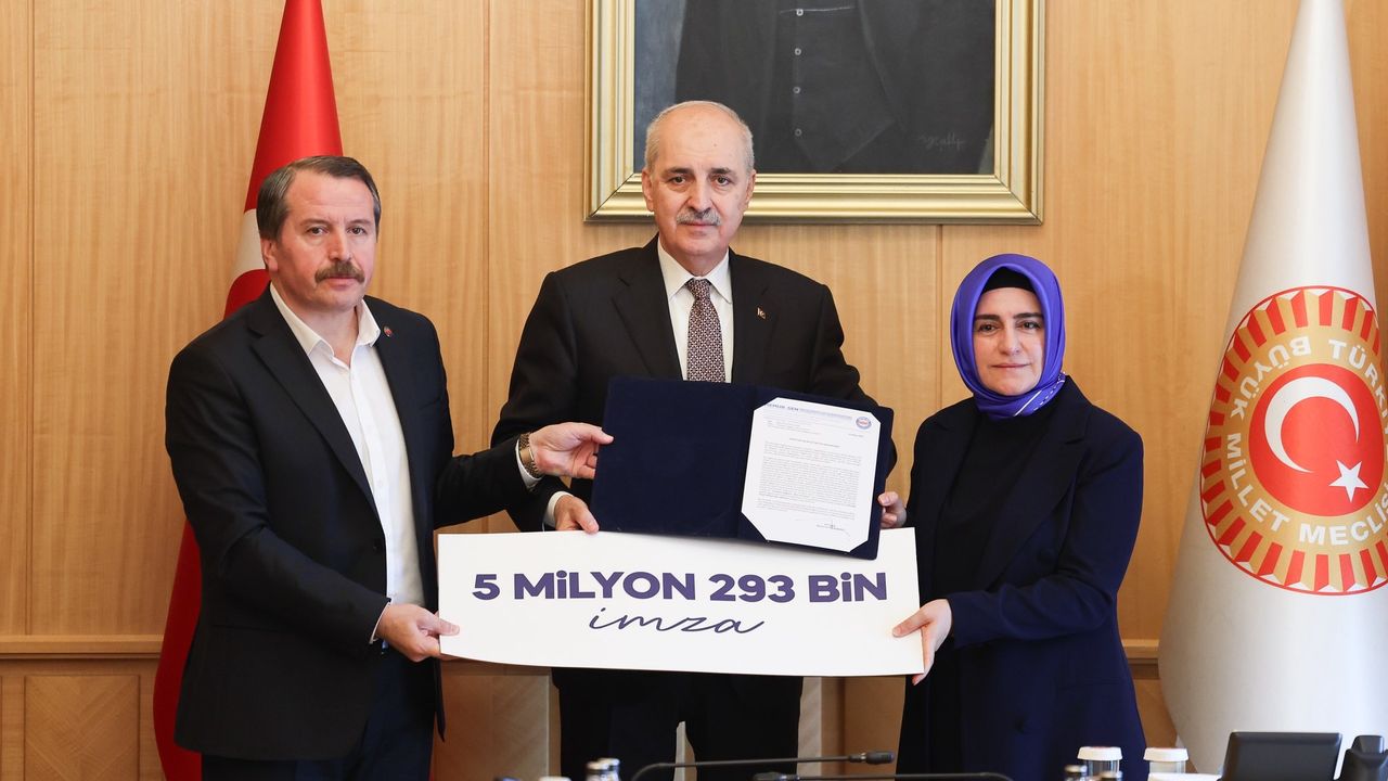 Meclis Başkanlığı Divan Salonu’ndaki kabulde, Memur-Sen Genel Başkanı Yalçın ile Memur-Sen Kadınlar Komisyonu Başkanı Sıdıka Aydın, ailenin korunmasına yönelik anayasa değişikliği talebiyle Memur-Sen tarafından 81 ilde yürütülen "Anayasa Değişsin Aile Korunsun" imza kampanyası kapsamında 5 milyon 293 bin imzanın bulunduğu dilekçeyi TBMM Başkanı Kurtulmuş’a takdim etti.