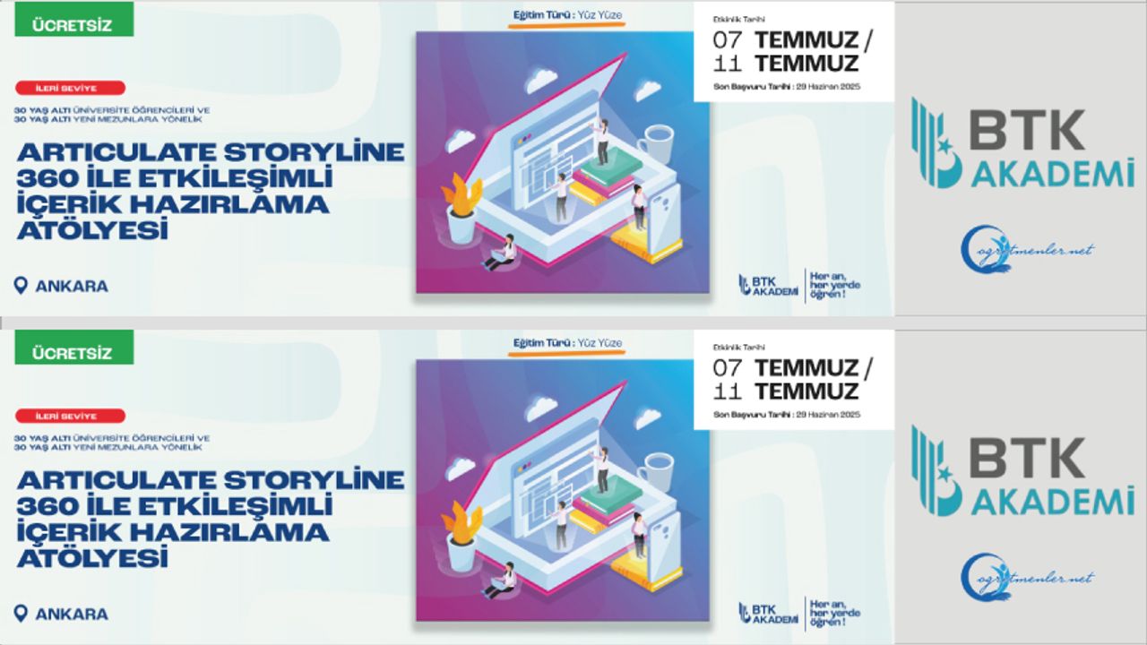 Artıculate Storylıne 360 ile Etkileşimli İçerik Hazırlama Atölyesi Ankara’da başlıyor! Temel bilgilerin ötesine geçerek, sıradan sunumları sürükleyici deneyimlere dönüştürmek ve Articulate Storyline 360 ile ileri düzey dijital içerikler üretmek istiyorsanız bu atölyeyi kaçırmayın.