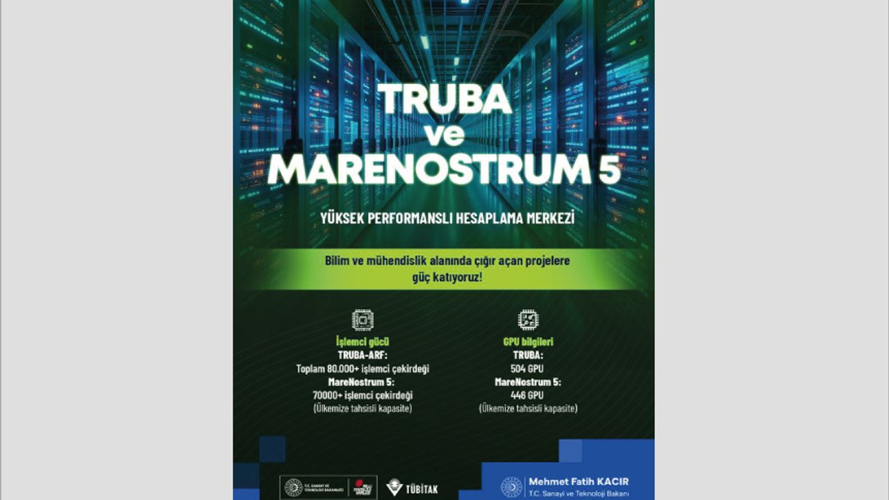 TRUBA-ARF, 80.000+ işlemci çekirdeği, 504 GPU ve 14 Petabyte veri depolama kapasitesiyle yapay zekâ, hesaplamalı bilimler, iklim modelleme ve malzeme simülasyonları gibi stratejik öneme sahip alanlarda araştırmacılara güçlü bir platform sunuyor. MareNostrum 5 altyapısı kapsamında ülkemize tahsis edilen 70.000+ işlemci çekirdeği ve 446 GPU kapasitesiyle, Barselona’daki sistemin yüksek başarımlı hesaplama gücünden yararlanıyoruz. Oluşturulan bu entegre altyapı sayesinde, Ar-Ge çalışmalarına hız katıyoruz. Üniversitelerimizin, kamu kurumlarımızın ve özel sektörümüzün erişimine açık bu kritik altyapılar, Türkiye’nin bilim ve teknoloji üretme kapasitesini yeni bir seviyeye taşıyor. http://portal.truba.gov.tr