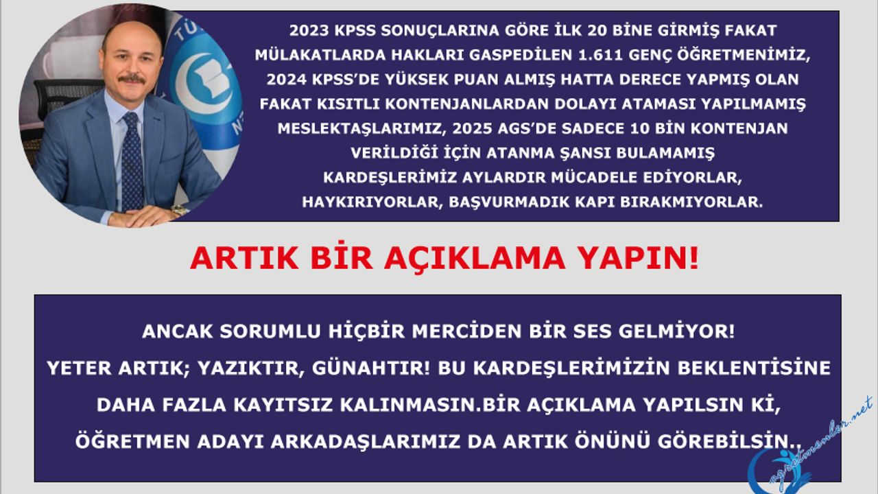 ARTIK BİR AÇIKLAMA YAPIN! 2023 KPSS sonuçlarına göre ilk 20 bine girmiş fakat mülakatlarda hakları gaspedilen 1.611 genç öğretmenimiz, 2024 KPSS’de yüksek puan almış hatta derece yapmış olan fakat kısıtlı kontenjanlardan dolayı ataması yapılmamış meslektaşlarımız, 2025 AGS’de sadece 10 bin kontenjan verildiği için atanma şansı bulamamış kardeşlerimiz aylardır mücadele ediyorlar, haykırıyorlar, başvurmadık kapı bırakmıyorlar. Ancak sorumlu hiçbir merciden bir ses gelmiyor! Yeter artık; yazıktır, günahtır! Bu kardeşlerimizin beklentisine daha fazla kayıtsız kalınmasın. Bir açıklama yapılsın ki, öğretmen adayı arkadaşlarımız da artık önünü görebilsin..