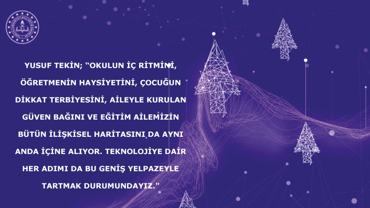 Bakan Tekin, teknolojinin eğitim alanına girdiğinde eğitimle kurulan ilişki biçiminin de değiştiğine dikkati çekerek, "Burada konuştuğumuz şey; okulun iç ritmini, öğretmenin haysiyetini, çocuğun dikkat terbiyesini, aileyle kurulan güven bağını ve eğitim ailemizin bütün ilişkisel haritasını da aynı anda içine alıyor. Teknolojiye dair her adımı da bu geniş yelpazeyle tartmak durumundayız." dedi.