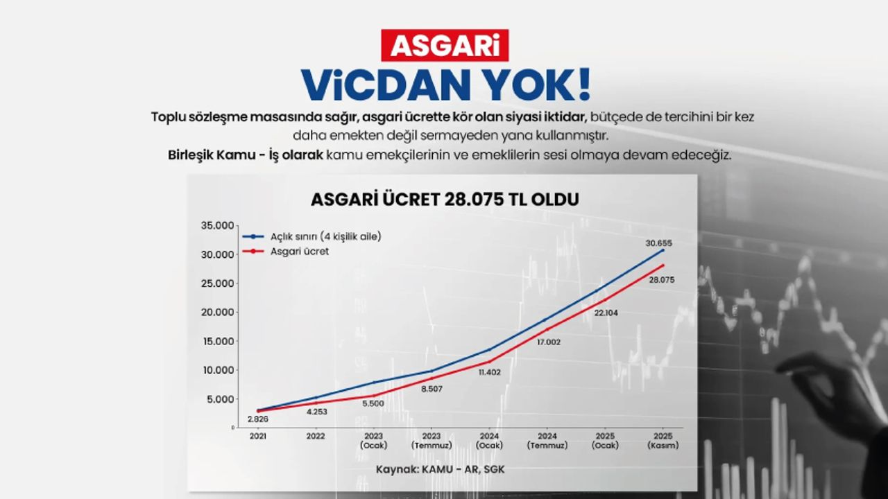 Birleşik Kamu-İş Konfederasyonu olarak altını çiziyoruz: Geçtiğimiz günlerde Meclis’ten geçirilen bütçe, emekçiyi ve emekliyi yok sayan, yoksulluğu kalıcı hale getiren bir tercihler bütçesi olmuştur. Toplu sözleşme masasında sağır, asgari ücrette kör olan siyasi iktidar, bütçede de tercihini bir kez daha emekten değil sermayeden yana kullanmıştır.