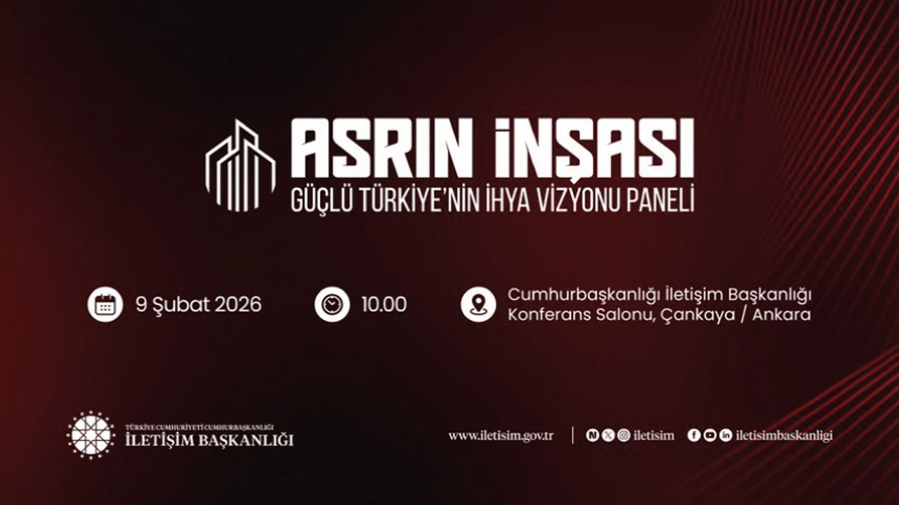 Cumhurbaşkanlığı İletişim Başkanlığımız tarafından “Asrın İnşası: Güçlü Türkiye’nin İhya Vizyonu Paneli” düzenlenecektir. : 9 Şubat 2026 : 10.00 : Cumhurbaşkanlığı İletişim Başkanlığı Konferans Salonu Kayıt için https://iletisim.gov.tr/turkce/09022026