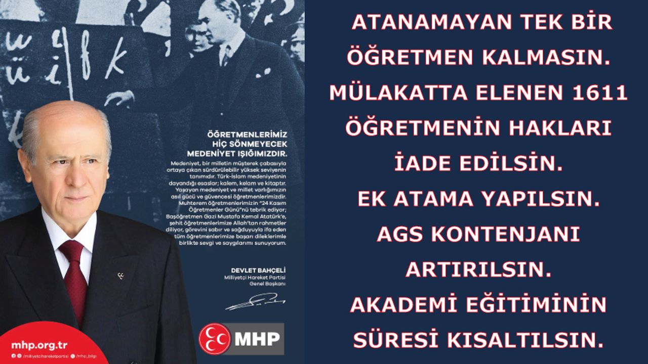 “ATANAMAYAN TEK BİR ÖĞRETMEN KALMASIN!” 2023 KPSS sonuçlarına göre ilk 20 bine girdiği halde mülakatlarda elenen 1611 öğretmenimizin, 2024 KPSS’de yüksek puan alan fakat çok kısıtlı kontenjanlardan dolayı ataması yapılmayan genç meslektaşlarımızın, 2024 AGS’de başarı gösteren ve sadece 10 bin kadro tahsis edilen öğretmen adaylarımızın mağduriyetlerinin giderilmesi talebini en açık şekilde gündeme getiren@MHP_BilgiGenel Başkanı Sayın@dbdevletbahceliye tüm meslektaşlarım adına teşekkürlerimi sunuyorum. Dilerim en kısa sürede genç öğretmenlerimizin bu son derece haklı ve makul beklentilerine uygun şekilde tedbirler hayata geçirilir.