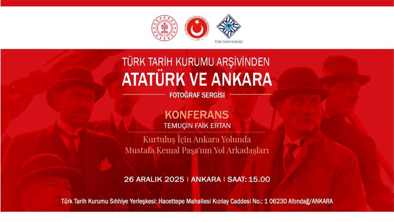 Kurumumuz tarafından Atatürk’ün Ankara’ya gelişinin 106. yılı vesilesiyle düzenlenecek olan “Türk Tarih Kurumu Arşivinden Atatürk ve Ankara Fotoğraf Sergisi” ile Prof. Dr. Temuçin Faik Ertan’ın vereceği “Kurtuluş İçin Ankara Yolunda Mustafa Kemal Paşa’nın Yol Arkadaşları” başlıklı konferansa davetlisiniz.