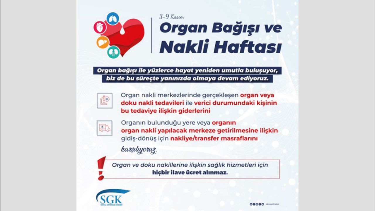 SUT kapsamında; organ doku nakli merkezlerinde gerçekleşen organ veya doku nakli tedavileri ile verici durumundaki kişinin bu tedaviye ilişkin giderlerini, organın nakil yapılacak merkeze getirilmesine ilişkin gidiş-dönüş için nakliye/transfer masraflarını karşılıyoruz. Bağışla yaşatmak elimizde 3-9 Kasım #OrganBağışıveNakliHaftası
