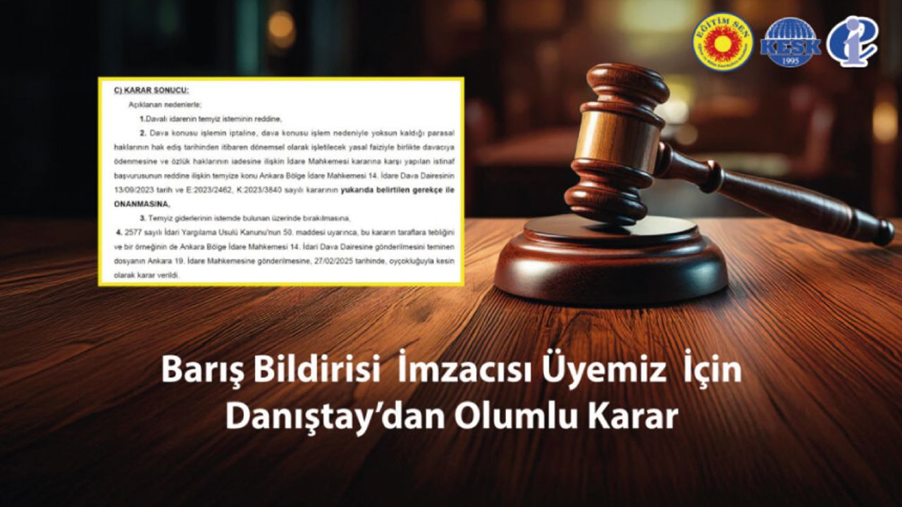Danıştay 5. Daire, barış akademisyeni olan üyemiz Ahmet Murat Aytaç hakkında verilen olumlu mahkeme kararını onadı. Böylece karar kesinleşmiş oldu.