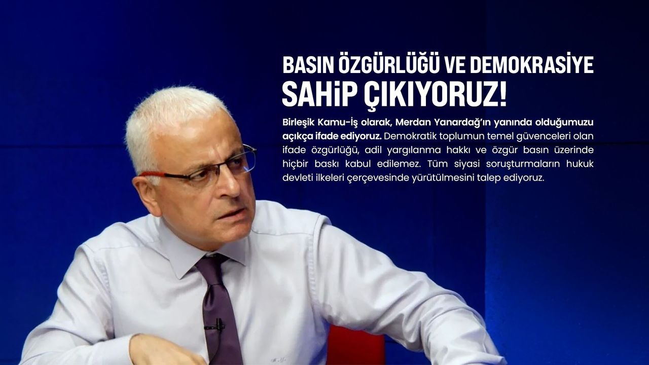 Birleşik Kamu-İş olarak her zaman demokrasiden, ifade özgürlüğünden ve özgür basından yana olduğumuzu bir kez daha vurguluyoruz. Siyasi dava ve soruşturmaların şeffaf, adil ve hukuk çerçevesinde yürütülmesi gerektiğini belirtiyor; Merdan Yanardağ başta olmak üzere, çağrılsalar ifade vermeye gidecek gazeteci ve siyasetçilerin tutuklu yargılanması uygulamasının derhal sona erdirilmelidir!