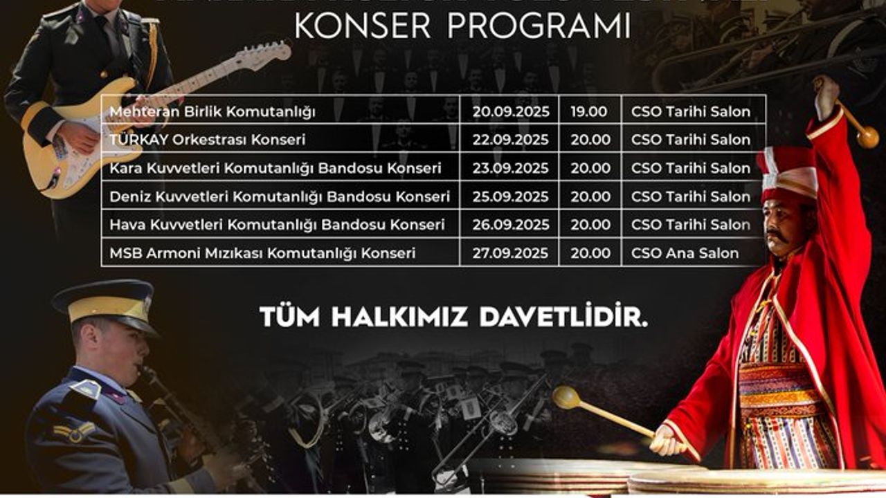 Kültür ve Turizm Bakanlığı tarafından Ankara'da düzenlenecek Başkent Kültür Yolu Festivali 2025 kapsamında Millî Savunma Bakanlığı Bandoları ve Mehteran Birliği konserleri halkımızla buluşuyor! 20-27 Eylül 2025 CSO Tarihi Salon & Ana Salon Tüm halkımız davetlidir.