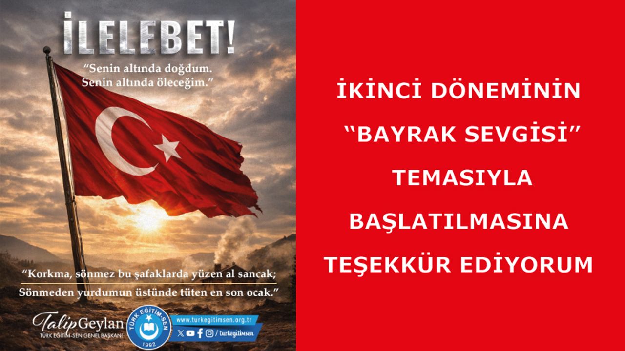 Talip Geylan @TalipGeylan06 Bayrak, istiklaldir. Bayrak, istikbaldir. Bayrak, vatandır. 2025-2026 Eğitim Öğretim Yılının ikinci Döneminin, “Bayrak Sevgisi” Temasıyla başlatılması kararından ötürü @tcmeb ‘mıza teşekkür ediyorum.
