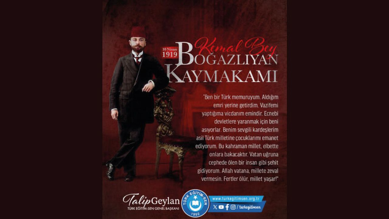 “Ben bir Türk memuruyum. Aldığım emri yerine getirdim. Vazifemi yaptığıma vicdanım emindir. Ecnebi devletlere yaranmak için beni asıyorlar. Benim sevgili kardeşlerim, asil Türk milletine çocuklarımı emanet ediyorum. Bu kahraman millet, elbette onlara bakacaktır. Vatan uğruna cephede ölen bir insan gibi şehit gidiyorum. Allah vatana, millete zeval vermesin. Fertler ölür, millet yaşar!" BOĞAZLIYAN KAYMAKAMI KEMAL BEY’i rahmet ve dualarla anıyoruz.