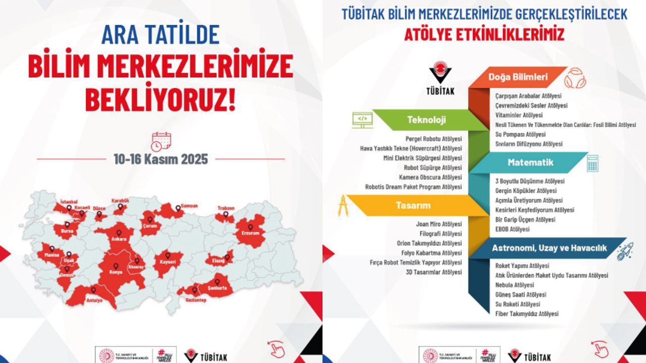 Bilim Merkezlerimiz sizleri bekliyor! Ara tatil döneminde, TÜBİTAK destekli Bilim Merkezlerimizde gençlerimizi; bilimsel keşiflere, yenilikçi düşünmeye, tasarlamaya ve üretmeye davet ediyoruz. Türkiye’nin dört bir yanındaki Bilim Merkezlerimizde; Doğa Bilimleri Matematik Teknoloji Astronomi, Havacılık ve Uzay ve daha birçok alanda düzenlenen atölyelerle bilimi eğlenceyle buluşturuyoruz. Bu tatilde; Deneyimleyerek öğrenin, Merakınızı bilimle derinleştirin, Hayal gücünüzü gerçeğe dönüştürün! Size en yakın TÜBİTAK Bilim Merkezi’ni ziyaret ederek program detaylarını alabilir, atölyelere katılabilirsiniz. Gençlerimizi bilimin parıltılı dünyasında buluşmaya davet ediyorum. Detaylı bilgi: http://bilimmerkezleri.tubitak.gov.tr/Icerik/bilim-merkezlerimizin-iletisim-bilgileri-257