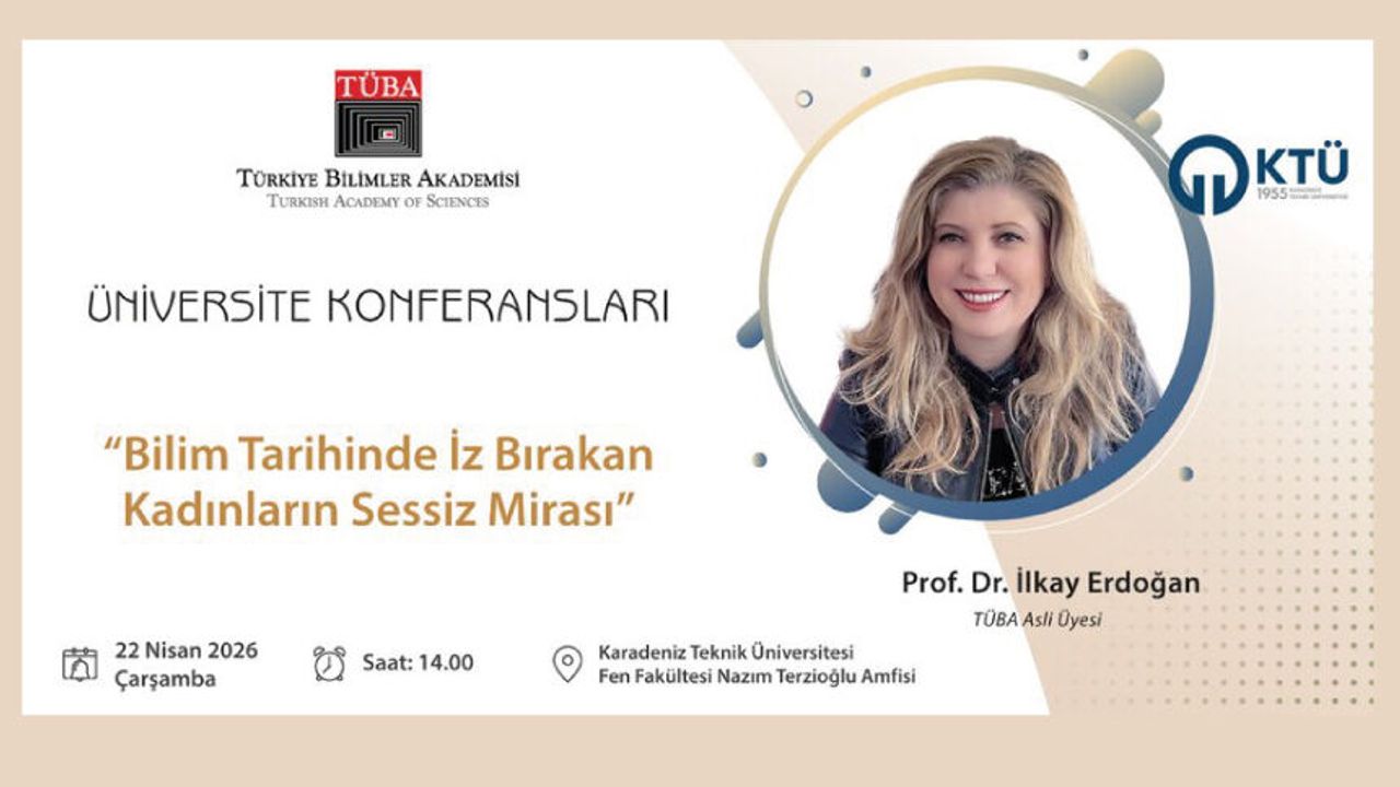 TÜBA Asli Üyesi Prof. Dr. İlkay Erdoğan, TÜBA Üniversite Konferansları Programı kapsamında Karadeniz Teknik Üniversitesi Fen Fakültesi Nazım Terzioğlu Amfisi’nde 22 Nisan 2026 tarihinde saat 14.00’te “Bilim Tarihinde İz Bırakan Kadınların Sessiz Mirası” konulu konferans verecek.