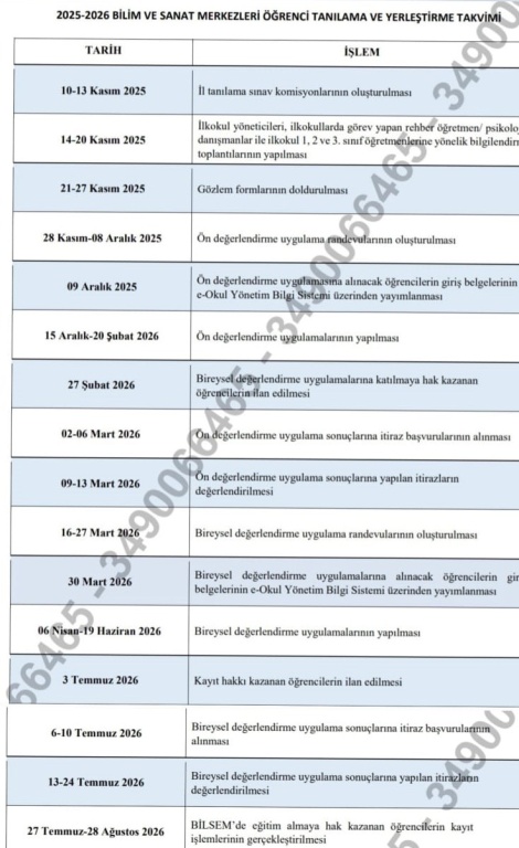 2025-2026 Yılı Bilim ve Sanat Merkezleri (BİLSEM) Öğrenci Tanılama ve Yerleştirme Kılavuzu Yayımlandı Yetenek Alanlarına Göre Öğrencilerin Aday Gösterilme İşlemleri: 21-27 Kasım 2025 Bireysel Değerlendirmeye Hak Kazanan Öğrencilerin İlanı: 27 Şubat 2026 Kayıt Hakkı Kazanan Öğrencilerin İlanı: 3 Temmuz 2026