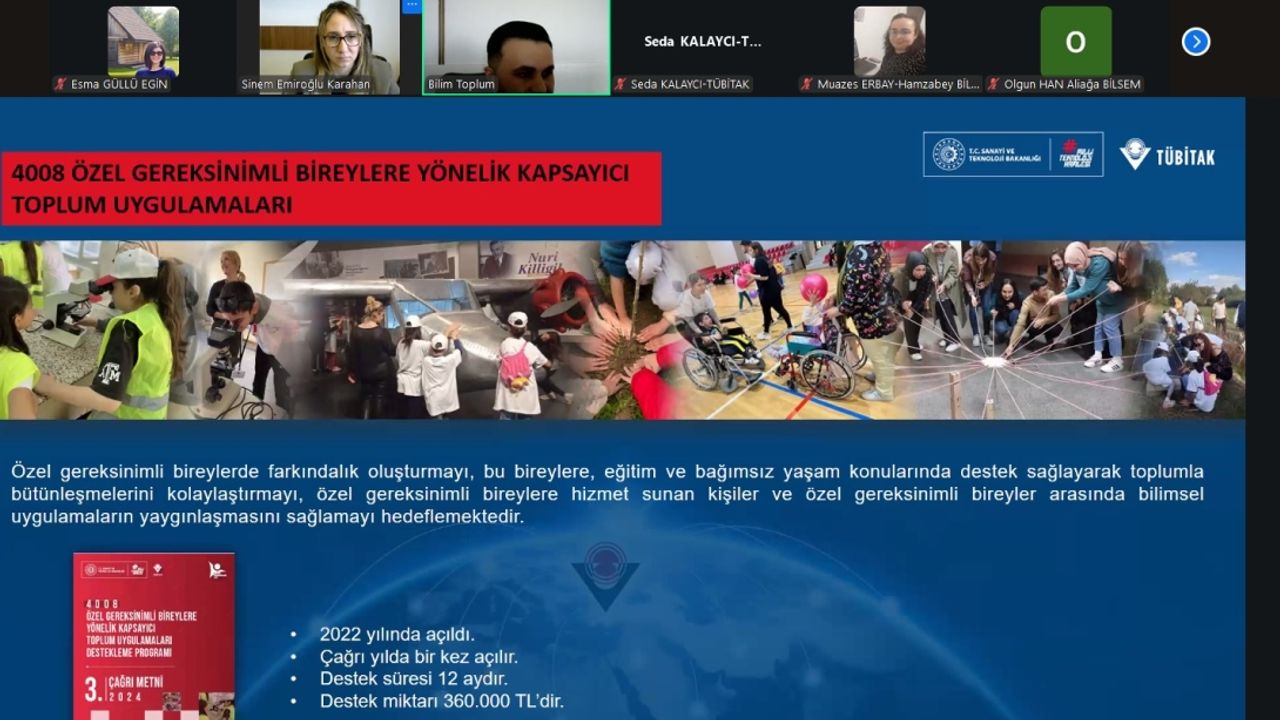 Eğitim program, Özel Yeteneklilerin Geliştirilmesi Daire Başkanı Sayın Ceyhun Sarı ve TÜBİTAK Destek Programları Müdürü Sayın Dr. Sinem Emiroğlu Karahan'ın açılış konuşmaları ile başladı. Açılış konuşmalarında, özel yetenekli öğrencilerin potansiyellerini keşfetme ve geliştirme sürecinde öğretmenlerin kritik rolüne vurgu yapılarak, destek programlarının eğitimde yenilikçi yaklaşımları güçlendirmedeki önemi vurgulandı. Programın, öğretmenlerin mesleki gelişimine katkı sunmasının yanı sıra, bilim ve teknoloji kültürünü yaygınlaştırarak ülkemizin geleceğinde söz sahibi olacak genç bilim insanlarının yetişmesine önemli destek sağlayacağı belirtildi.