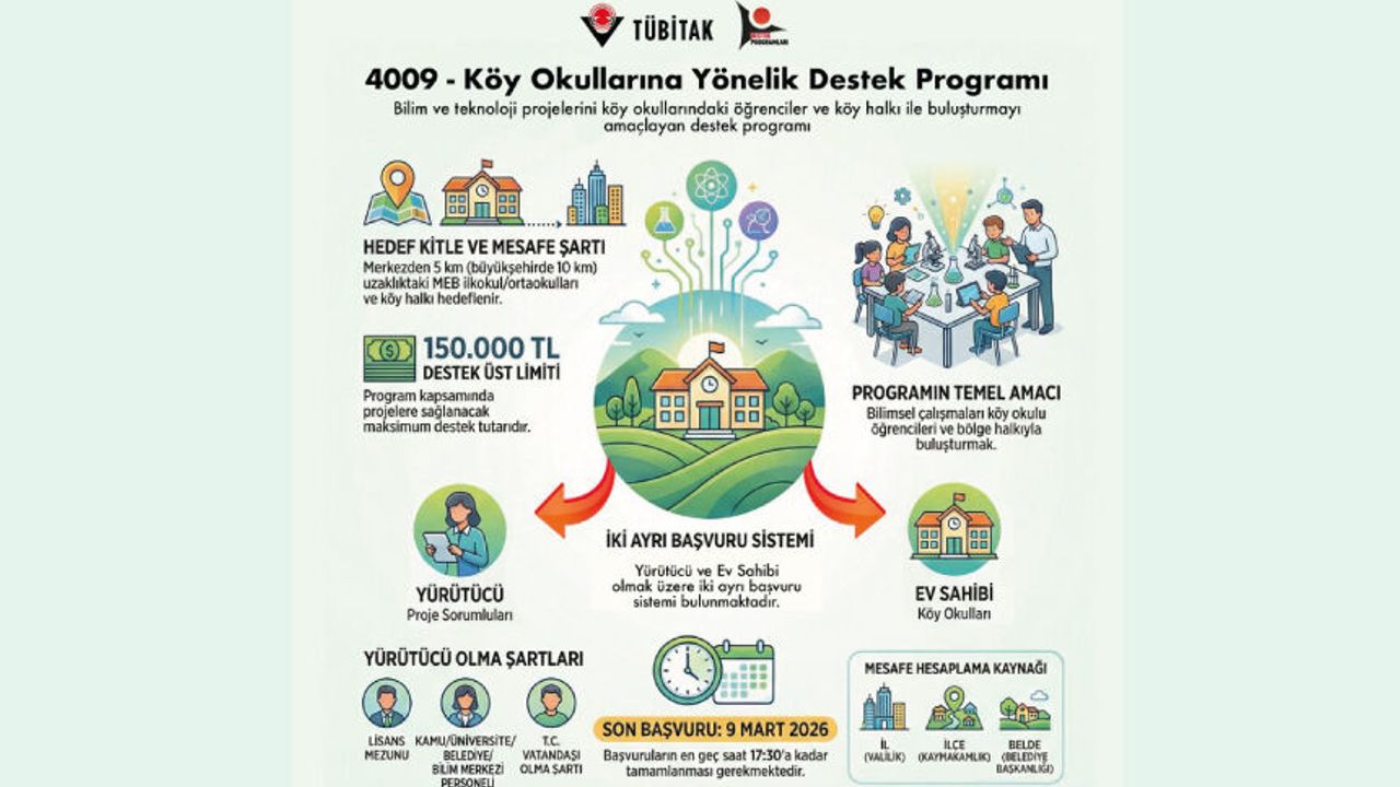 TÜBİTAK 4009 Köy Okullarına Yönelik Destek Programı ile bilimsel projeleri köy okullarına ve bölge halkına taşıyoruz! Son Başvuru Tarihi: 9 Mart 2026