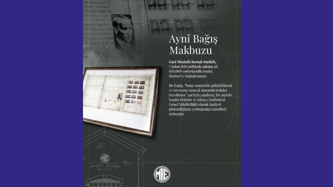 BİR BAĞIŞTAN DAHA FAZLASI Gazi Mustafa Kemal Atatürk, 7 Şubat 1936 tarihinde şahsına ait 600.000 metrekarelik araziyi Hazine’ye bağışlamıştır. Bu bağış, “harp sanayinin geliştirilmesi ve savunma sanayii alanında tesisler kurulması” şartıyla yapılmıştır. Atatürk’ün bu vizyoner adımıyla, bugün Makine ve Kimya Endüstrisi Genel Müdürlüğü olarak faaliyet gösterdiğimiz yerleşkenin temelleri atılmıştır. Bu miras, yalnızca bir arazi değil; Türkiye’nin kendi savunma sanayii bağımsızlığının simgelerinden birisidir. Aynî bağış makbuzunu ve Türk savunma sanayiine dair birçok eseri, MKE İmalât-ı Harbiye Müzemizde ücretsiz olarak ziyaret edebilirsiniz.