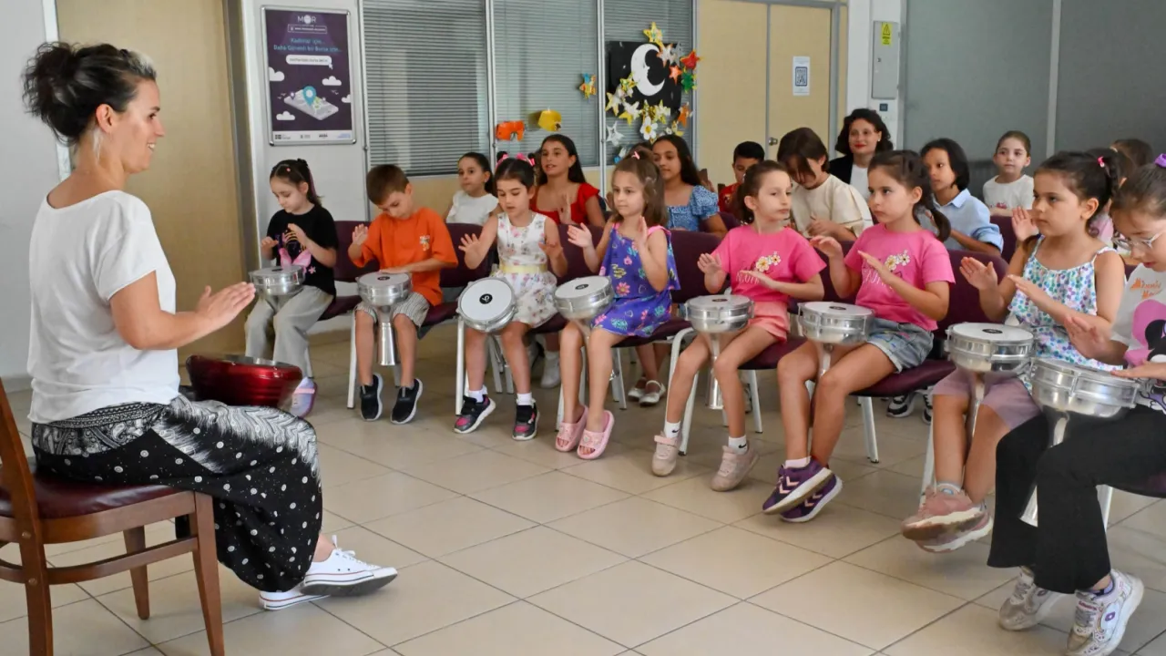 Çocuk Ritim Atölyesi’ne katılan 6-9 yaş arasındaki çocuklar, Halk Dansları Antrenörü Hanımşah Işıkcan eşliğinde darbuka çalarak ritim tuttu. Kendilerini müzikle ifade etme imkanı bulan çocuklar, hem takım çalışması yapmayı öğrenirken, hem de eğlenceli bir gün geçirdi.