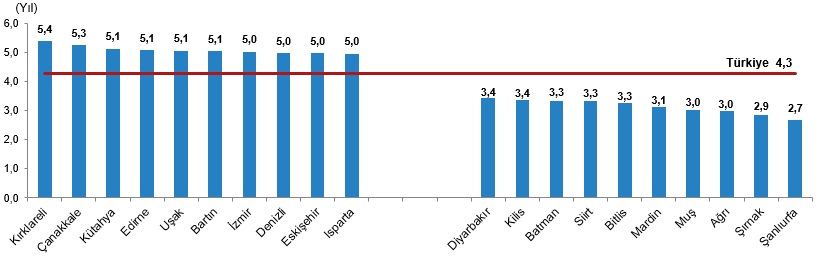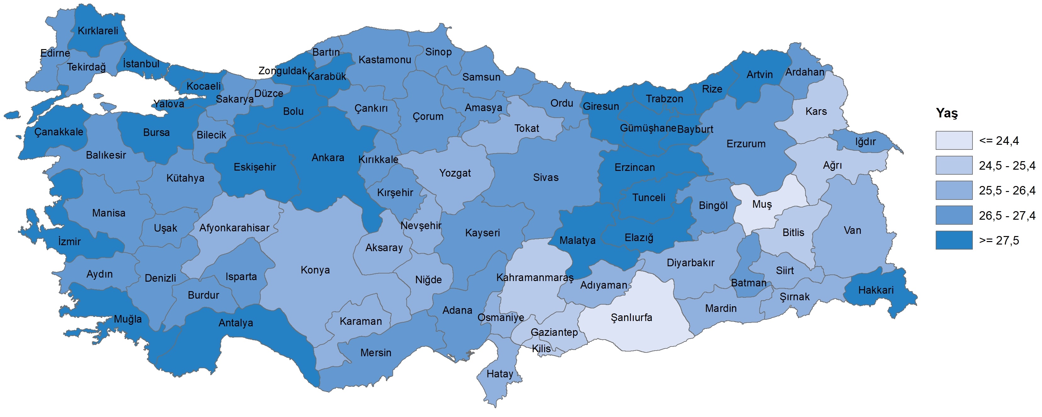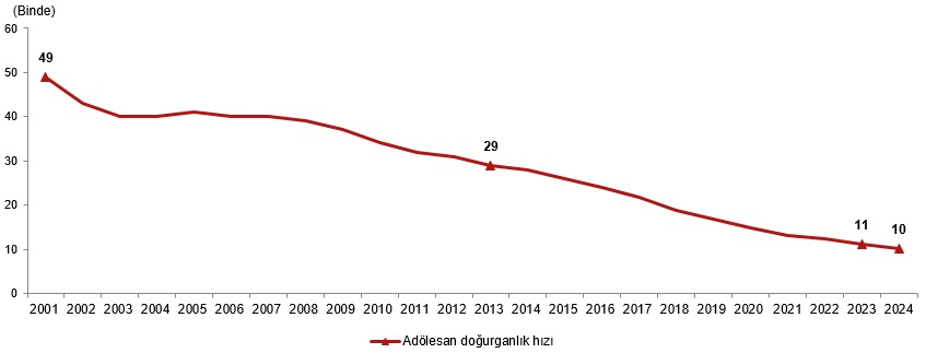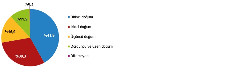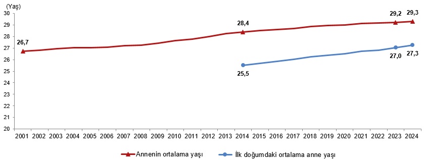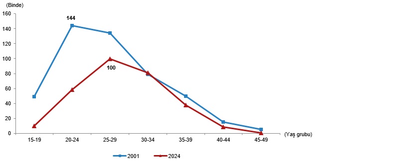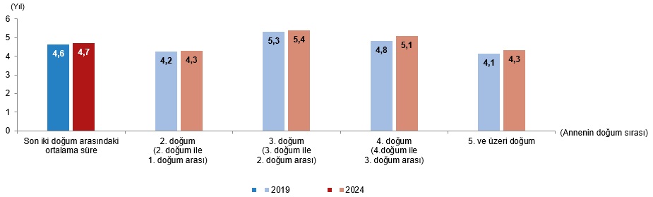 Yüksek öğretim mezunu annelerin toplam doğurganlık hızı 2024 yılında 1,22 çocuk oldu Annenin eğitim durumuna göre toplam doğurganlık hızı incelendiğinde, 2024 yılında en yüksek toplam doğurganlık hızı okuma yazma bilmeyen/okuma yazma bilen fakat bir okul bitirmeyen anneler için 2,65 çocuk iken en düşük toplam doğurganlık hızı yüksek öğretim mezunu anneler için 1,22 çocuk oldu. Annenin eğitim durumuna göre toplam doğurganlık hızı, 2019, 2024 ![]() Yoğun kent olarak sınıflandırılan yerlerde toplam doğurganlık hızı 2024 yılında 1,39 çocuk oldu Mekânsal Adres Kayıt Sistemi'nin (MAKS) kullanılmaya başlanması ile birlikte fiili kent-kır yapısını daha doğru yansıtan, "yoğun kent, orta yoğun kent ve kır"(1) ayrımında oluşturulan yeni bir sınıflama yapılmıştır. Kent-kır sınıflamasına göre toplam doğurganlık hızı incelendiğinde, 2024 yılında kır olarak sınıflandırılan yerlerde toplam doğurganlık hızı 1,83 çocuk iken orta yoğun kent olarak sınıflandırılan yerlerde 1,58 çocuk ve yoğun kent olarak sınıflandırılan yerlerde ise 1,39 çocuk oldu. Kent-kır sınıflamasına göre toplam doğurganlık hızı, 2023, 2024 ![]() Kaba doğum hızı binde 11,0 oldu Kaba doğum hızı, bin nüfus başına düşen canlı doğum sayısını ifade etmektedir. Kaba doğum hızı, 2001 yılında binde 20,3 iken 2024 yılında binde 11,0 oldu. Diğer bir ifade ile 2001 yılında bin nüfus başına 20,3 doğum düşerken, 2024 yılında 11,0 doğum düştü. Yaşa özel doğurganlık hızının en yüksek olduğu yaş grubu 25-29 oldu Yaşa özel doğurganlık hızı, belli bir yaş grubunda bin kadın başına düşen ortalama canlı doğan çocuk sayısını ifade etmektedir. Yaş grubuna göre doğurganlık hızı incelendiğinde, 2001 yılında en yüksek yaşa özel doğurganlık hızı binde 144 ile 20-24 yaş grubunda iken 2024 yılında binde 100 ile 25-29 yaş grubunda görüldü. Bu durum, doğurganlığın kadının daha ileri yaşlarında gerçekleştiğini gösterdi. Yaşa özel doğurganlık hızı, 2001, 2024 ![]() Adölesan doğurganlık hızı düştü Adölesan doğurganlık hızı, 15-19 yaş grubunda bin kadın başına düşen ortalama canlı doğan çocuk sayısını ifade etmektedir. Adölesan doğurganlık hızı, 2001 yılında binde 49 iken 2024 yılında binde 10'a düştü. Diğer bir ifadeyle, 2024 yılında 15-19 yaş grubundaki her bin kadın başına 10 doğum düştü. Adölesan doğurganlık hızı, 2001-2024 ![]() Annenin son iki doğumu arasındaki ortalama süre 2024 yılında 4,7 yıl oldu Annenin "son iki doğumu arasındaki ortalama süre"(2) incelendiğinde, bu süre 2019 yılında 4,6 yıl iken 2024 yılında 4,7 yıl oldu. 2024 yılında 2. doğumunu yapan annelerin ilk gerçekleştirdiği doğumu ile bu doğumu arasındaki ortalama süre 4,3 yıl oldu. Doğum yapan annelerden 2024 yılında 3. doğumunu gerçekleştirenlerin 2. doğumu ile arasındaki ortalama süre ise 5,4 yıl oldu. Doğum sırasına göre son iki doğum arasındaki ortalama süre, 2019, 2024 ![]() Annenin 2. ile 1. doğumu arasındaki ortalama sürenin en kısa olduğu il, 2,7 yıl ile Şanlıurfa oldu Doğum yapan annelerden 2024 yılında 2. doğumunu gerçekleştirenlerin 1. doğumu arasındaki ortalama sürenin en uzun olduğu il, 2024 yılında 5,4 yıl ile Kırklareli oldu. Bu ili 5,3 yıl ile Çanakkale, 5,1 yıl ile Kütahya, Edirne, Uşak ve Bartın izledi. Annenin 2. ile 1. doğumu arasındaki ortalama sürenin en kısa olduğu il, 2024 yılında 2,7 yıl ile Şanlıurfa oldu. Bu ili 2,9 yıl ile Şırnak, 3,0 yıl ile Ağrı ve Muş izledi. Annenin 2. ile 1. doğumu arasındaki ortalama süresinin en uzun ve en kısa olduğu 10 il, 2024 ![]() Doğum yapan annelerin ortalama yaşı 29,3 oldu Doğumlarını 2001 yılında gerçekleştiren annelerin ortalama yaşı 26,7 iken 2024 yılında 29,3 oldu. İlk doğumunu 2024 yılında gerçekleştiren annelerin ortalama yaşı ise 27,3 oldu. Annenin ortalama yaşı ve ilk doğumdaki ortalama anne yaşı, 2001-2024 ![]() İlk doğumdaki ortalama anne yaşının en yüksek olduğu il 29,4 ile Tunceli oldu İlk doğumdaki ortalama anne yaşı illere göre incelendiğinde, 2024 yılında ilk doğumda ortalama anne yaşının en yüksek olduğu il 29,4 ile Tunceli oldu. Bu ili 29,0 yaş ile Artvin, 28,8 yaş ile İstanbul izledi. İlk doğumdaki ortalama anne yaşının en yüksek ve en düşük olduğu 10 il, 2024 ![]() İlk doğumdaki ortalama anne yaşının en düşük olduğu iller ise 24,4 ile Şanlıurfa ve Muş oldu. Bu illeri 24,5 yaş ile Ağrı, 25,2 yaş ile Gaziantep izledi. İllere göre ilk doğumdaki ortalama anne yaşı, 2024 ![]() Doğumların %3,3'ü çoğul doğum olarak gerçekleşti Çoğul doğum sayısı 2024 yılında 31 bin 109 oldu. Doğumların 2024 yılında %3,3'ü çoğul doğum olarak gerçekleşirken, bu doğumların %97,0'ı ikiz, %2,9'u üçüz ve %0,1'i dördüz ve daha fazla bebek olarak gerçekleşti. Doğumların %41,9'u annenin ilk doğumu olarak gerçekleşti Doğum sırasına göre doğumlar incelendiğinde, 2024 yılında doğumların %41,9'unun ilk, %30,3'ünün ikinci, %16,0'ının üçüncü, %11,5'inin ise dördüncü ve üzeri doğum olarak gerçekleştiği görüldü. Doğum sırasına göre doğumların oranı, 2024 ![]() Bu konu ile ilgili bir sonraki haber bülteninin yayımlanma tarihi Mayıs 2026'dır. _______________________________________________________________________________________________ AÇIKLAMALAR Merkezi Nüfus İdaresi Sistemi'nin (MERNİS) 2001 yılında on-line uygulamaya geçmesiyle doğum istatistikleri bu veri tabanından üretilmeye başlanmıştır. Doğum verisi, idari kayıtlara gecikmeli yansıyan yeni kayıtlardan dolayı 5 yıl geriye dönük olarak güncellenmektedir. Bu haber bülteninde, 2019-2023 yıllarına ilişkin doğum istatistiklerinin 31 Mart 2025 tarihi it