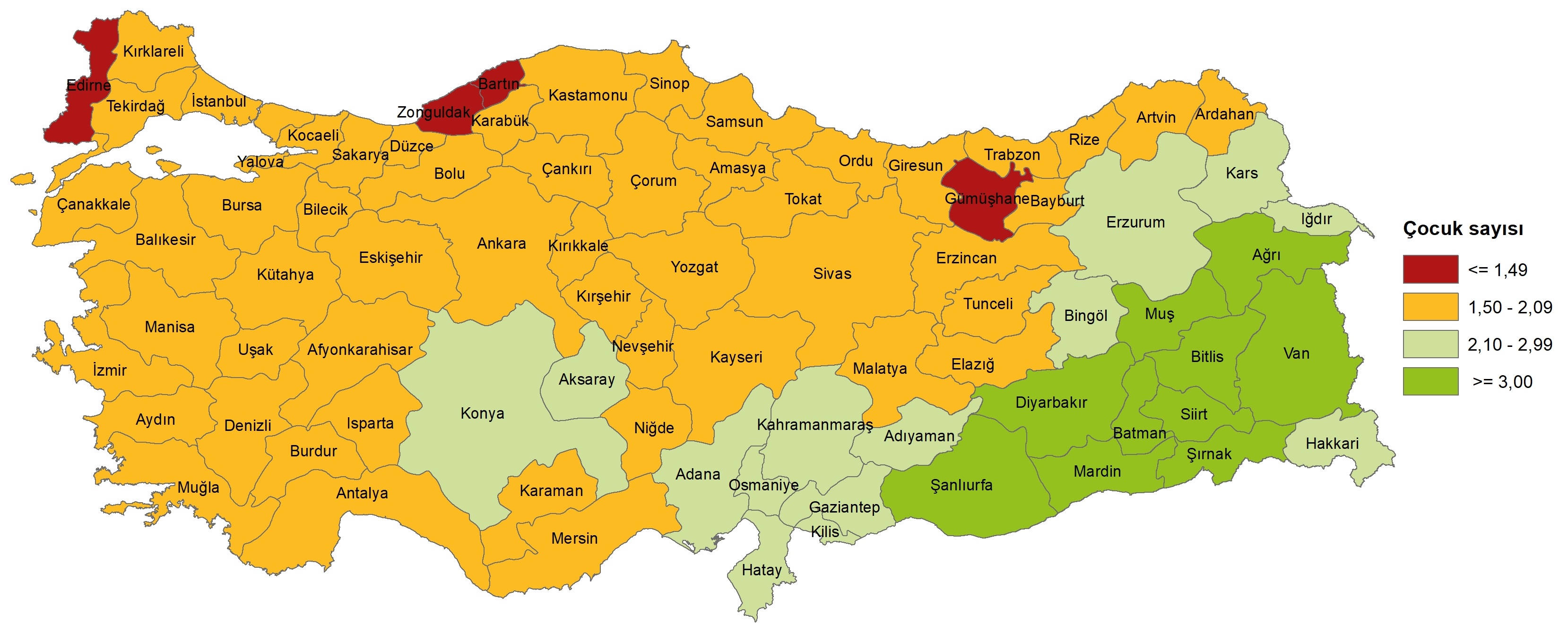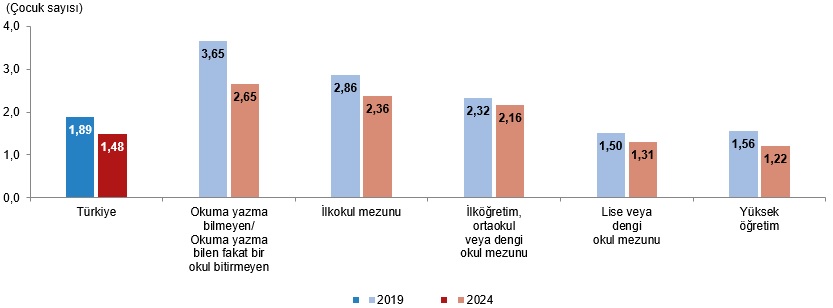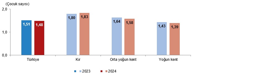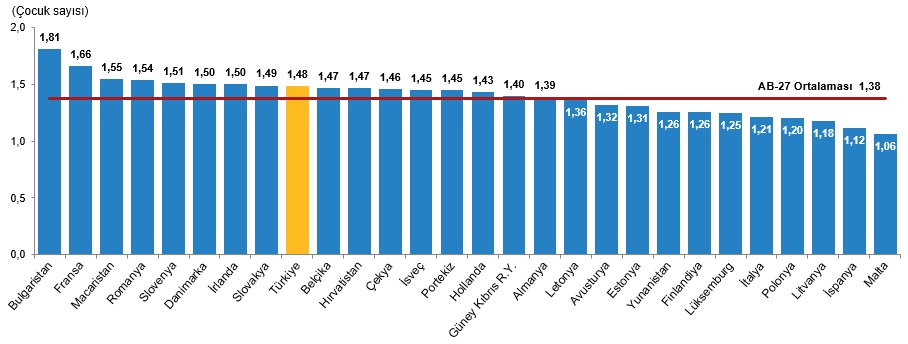 Doğum İstatistikleri, 2024 Canlı doğan bebek sayısı 937 bin 559 oldu Canlı doğan bebek sayısı 2024 yılında 937 bin 559 oldu. Canlı doğan bebeklerin %51,4'ü erkek, %48,6'sı kız oldu. Toplam doğurganlık hızı 1,48 çocuk oldu Toplam doğurganlık hızı, bir kadının doğurgan olduğu dönem olan 15-49 yaş grubunda doğurabileceği ortalama çocuk sayısını ifade etmektedir. Toplam doğurganlık hızı, 2001 yılında 2,38 çocuk iken 2014 yılından itibaren aralıksız düşüş eğilimine girerek 2024 yılında 1,48 çocuk olarak gerçekleşti. Toplam doğurganlık hızı son sekiz yıldır nüfusun yenilenme seviyesi olan 2,10'un altında kalmaya devam etti. Doğum sayısı ve toplam doğurganlık hızı, 2001-2024 Toplam doğurganlık hızının en yüksek olduğu il 3,28 çocuk ile Şanlıurfa oldu Toplam doğurganlık hızının en yüksek olduğu il 2024 yılında 3,28 çocuk ile Şanlıurfa oldu. Bu ili 2,62 çocuk ile Şırnak, 2,32 çocuk ile Mardin izledi. Toplam doğurganlık hızının en yüksek ve en düşük olduğu 10 il, 2024 ![]() Toplam doğurganlık hızının en düşük olduğu iller ise 1,12 çocuk ile Bartın ve Eskişehir oldu. Bu illeri 1,15 çocuk ile Zonguldak ve Ankara, 1,17 çocuk ile İzmir izledi. Toplam doğurganlık hızı 2024 yılında 71 ilde 2,10'un altında kaldı Toplam doğurganlık hızının nüfusun yenilenme seviyesinin altına düştüğü 2017 yılında 57 ilin toplam doğurganlık hızı 2,10'un altında iken 2024 yılında 71 ilin toplam doğurganlık hızı bu seviyenin altında kaldı. Toplam doğurganlık hızının 1,50'nin altında kaldığı il sayısı 2017 yılında 4 iken 2024 yılında 55 oldu. Toplam doğurganlık hızının 3 çocuk ve üzerinde olduğu il sayısı 2017 yılında 10 iken 2024 yılında sadece Şanlıurfa ili oldu. İllere göre toplam doğurganlık hızı, 2017 ![]() İllere göre toplam doğurganlık hızı, 2024 ![]() Toplam doğurganlık hızının Avrupa Birliği üye ülkeleri ortalaması 1,38 çocuk oldu Avrupa Birliği üyesi 27 ülkenin toplam doğurganlık hızları incelendiğinde, 2023 yılında en yüksek toplam doğurganlık hızına sahip olan ülkenin 1,81 çocuk ile Bulgaristan olduğu, en düşük toplam doğurganlık hızına sahip olan ülkenin ise 1,06 çocuk ile Malta olduğu görüldü. Toplam doğurganlık hızı 2024 yılında binde 1,48 olan Türkiye, Avrupa Birliği üyesi ülkeler arasında 9. sırada yer aldı. Toplam doğurganlık hızının Avrupa Birliği üye ülkeleri ile karşılaştırması, 2023