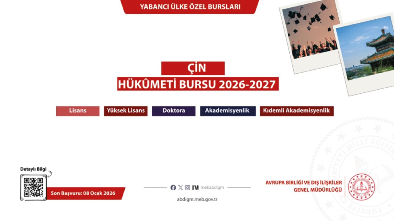 Çin Hükûmeti Bursu Başvuruları Başladı (2026–2027) Çin Halk Cumhuriyeti tarafından 2026–2027 akademik yılı için tahsis edilen toplam 13 adet Lisans, Yüksek Lisans, Doktora, Akademisyenlik ve Kıdemli Akademisyenlik bursu için başvuru süreci başlamıştır.