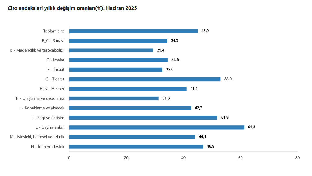 Toplam cironun alt detaylarına bakıldığında; 2025 yılı Haziran ayında yıllık sanayi sektörü ciro endeksi %34,3 arttı, inşaat ciro endeksi %32,6 arttı, ticaret ciro endeksi %53,0 arttı, hizmet ciro endeksi %41,1 arttı.