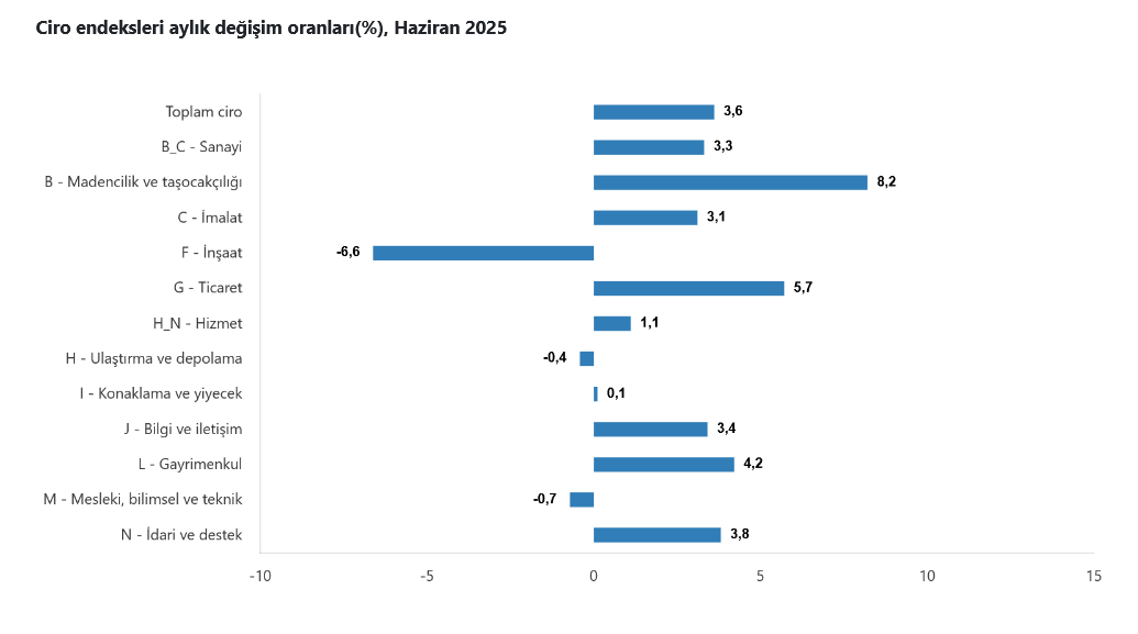 Toplam cironun alt detaylarına bakıldığında; 2025 yılı Haziran ayında aylık sanayi sektörü ciro endeksi %3,3 arttı, inşaat ciro endeksi %6,6 azaldı, ticaret ciro endeksi %5,7 arttı, hizmet ciro endeksi %1,1 arttı.