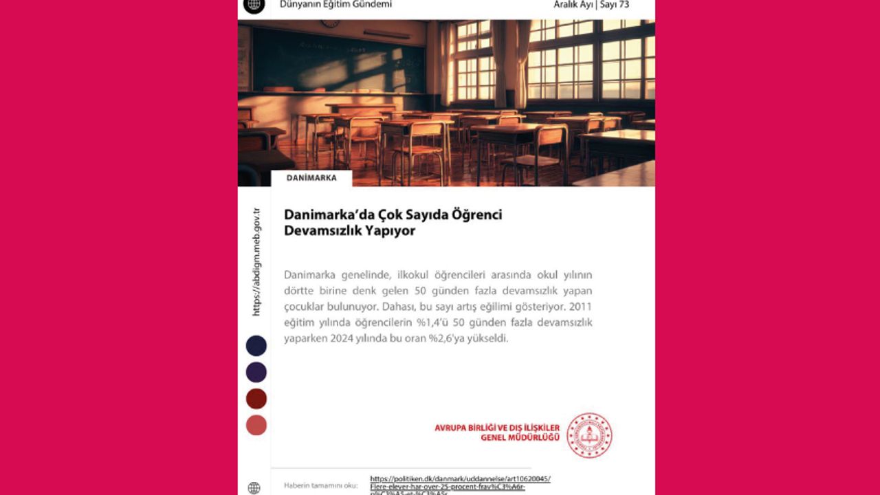 Danimarka’da Çok Sayıda Öğrenci Devamsızlık Yapıyor Genel Müdürlüğümüzce hazırlanan “Dünyanın Eğitim Gündemi” e-bülteninin 73. sayısında haberin devamını okuyabilirsiniz. e-Bülten: https://meb.ai/UXyFzlN