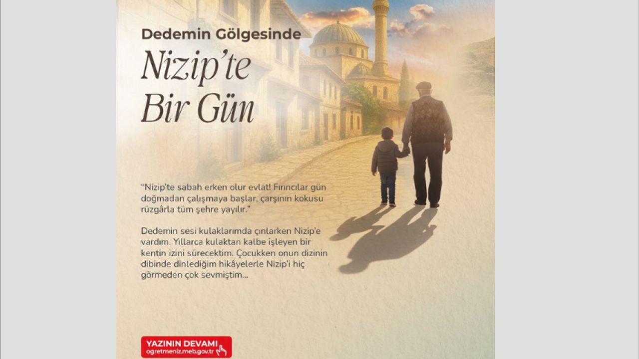 Sabahın erken saatlerinde Nizip sokaklarında bir çocukluk yolculuğu… Taner ŞEN'den "Dedemin Gölgesinde Nizip'te Bir Gün" anısı ÖğretmenİZ dergisinde! Dedesiyle olan manevi bağını, Nizip'in sokaklarında adımlarken hissettiklerini anlattığı bu duygu yüklü anıyı hemen okuyun! Okumak için http://meb.ai/UH2c0oy