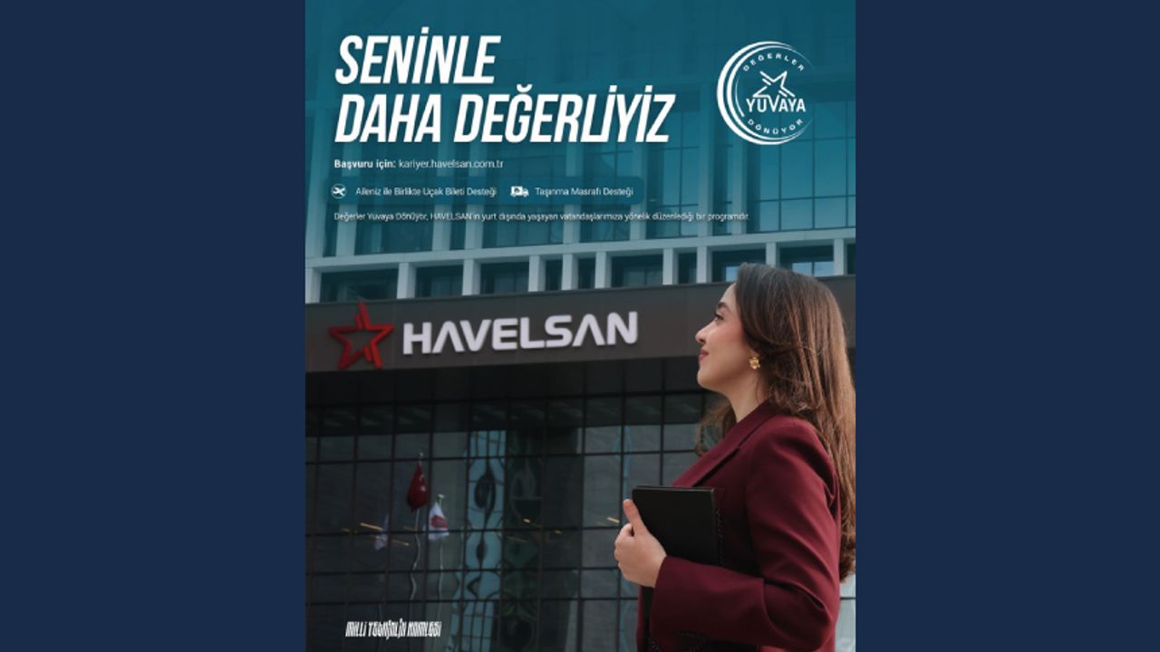 Yurt dışında yaşayan değerlerimizin bilgi, birikim ve tecrübelerini millî teknoloji çalışmalarına aktarabilmeleri için “Değerler Yuvaya Dönüyor” programını sürdürmeye devam ediyoruz. Millî Yetkinlik Hamlesi kapsamında yürüttüğümüz bu yolculukta, yurt dışında yaşayan vatandaşlarımızı Türkiye’nin güçlü ve güvenli geleceğine birlikte imza atmaya davet ediyoruz. Başvuru için: http://kariyer.havelsan.com.tr #DeğerlerYuvayaDönüyor